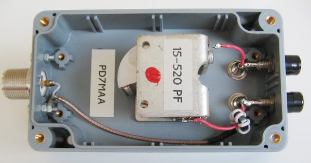 The design uses a single 15-520 pF type tuning capacitor combined with a FT37-43 toroid having 7 turns on the coax side. The loop is made of 3mm brass wire 1m long. Use only plastic enclosures. Tuning range is 6.8 - 31 MHz with oustanding performance. This is also a verry good direction finding antenna. A RG-213 loop of 130 cm gives a higher Q with much stronger signals.